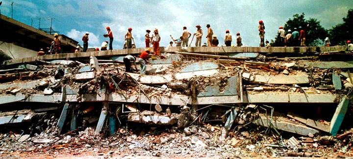 En la imagen una serie de objetos rescatados de una oficina de la zona centro del Distrito Federal, entre ellos un reloj que marca la hora en que ocurrió el sismo: 7:19 de la mañana.La zona centro, principalmente las delegaciones Cuauhtémoc y Benito Juárez fueron de las más afectadas. Sobre calzada de Tlalpan se podía apreciar una serie de edificios derrumbados.Un edificio en la colonia Roma en el cruce de la calle Uruapan e Insurgentes, que posteriormente seria completamente derrumbado, se puede apreciar en esta fotografía tomada la mañana del 19 de septiembre.Debido a la hora del sismo, algunos comercios aún no abrían sus puertas como es el caso de una papelería y una tienda de equipos de refrigeración en la Avenida Chapultepec, casi esquina con Insurgentes.La tragedia superó la capacidad de los cuerpos de rescate para atender a las víctimas y sería hasta varios meses después que se conocería el número estimado de muertos y heridos.Ante la incapacidad de las autoridades para realizar las labores de rescate, la sociedad civil se involucró en estas tareas y a pesar de los escasos recursos lograron salvar a decenas de personas.Junto a la tienda del Fondo Nacional Para el Fomento de las Artesanías (Fonart) se aprecia un edificio completamente derrumbado en la colonia Tabacalera.En la zona de los talleres de costura en la avenida Izazaga y Pino Suárez, en el centro de la ciudad, decenas de trabajadoras perdieron la vida, pues muchas de ellas cubrían el turno nocturno.Detrás de una reja un joven contempla los restos de una edificio en la zona de Tlatelolco, una de las zonas habitacionales más modernas de la época y que resultó gravemente afectada.Un policía camina en el cruce de las avenidas Juárez y Balderas, en el centro de la ciudad, donde estaba ubicado el famoso Hotel Regis que después del sismo desapareció.