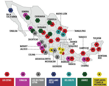 El cártel de Juárez, La Familia Michoacana y Los Caballeros Templarios, el cártel de los Beltrán Leyva, el Pacífico o Sinaloa, de los Arellano Félix, Los Zetas y el cártel del Golfo.