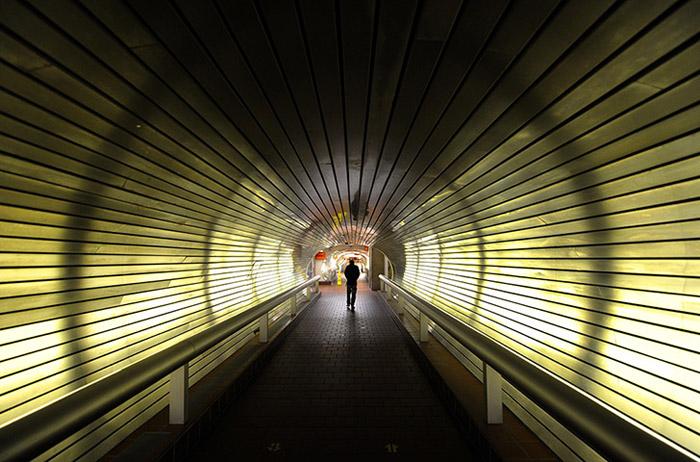 Un hombre camina sobre el túnel del tren subterraneo en la ciudad de New Haven, Connecticut, EU.