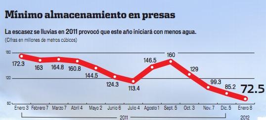 Antonio Gutiérrez, director de Agua Potable, Drenaje y Saneamiento de la Conagua, refirió que esta situación se debe a la escasez de lluvias que se tuvo el año pasado y que se prevé sea similar en este 2012. Las presas del Cutzamala registran un almacenamiento de 568 millones de metros cúbicos, lo que representa 98 millones menos que en enero de 2011. La tendencia para el resto del año es en picada por la sequía que se extenderá hasta junio o julio, cuando lleguen las lluvias.