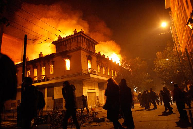 Desde hace más de dos años la crisis financiera que afecta a Grecia ha provocado diversos conflictos en este país.Este fin de semana en parlamento griego debatió una ley de austeridad que contempla reducir el salario mínimo de los trabajadores.Desde el viernes y sábado cientos de personas marcharon por las calles de Atenas y se manifestaron afuera de la sede de gobierno y el parlamento.El sábado la policía antimotines desalojó a los manifestantes y estos respondieron lanzando piedras y cócteles molotov.Pero la madrugada del lunes los enfrentamientos se recrudecieron y los manifestantes incendiaron varios edificios, locales comerciales e incluso una sala de cine.La policía de Atenas detuvo a más de 130 personas y otras cien resultaron lesionadas por balas de goma y gas lacrimógeno.Una imagen que captó la atención de la prensa internacional fue la detención del compositor y activista Mikis Theodorakis, de 88 años de edad.En esta imagen un hombre mayor que ha sido rociado con agua y gas se encara, alzando una sombrilla, con los policías de Atenas.En diferentes edificios públicos se han pintado consignas como esta que dice “Robar para ganar dinero”.El enfrentamiento ha durado varias horas y aunque la policía ha logrado contener a los manifestantes, estos se han reorganizado en las calles cercanas al centro de Atenas.