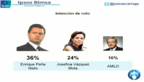 Según datos de esta encuestadora, Enrique Peña Nieto tiene 36% de la intención voto, su pico más alto fue a final de octubre de 2011 cuando tenía 54%, lo que significa una caída de 18 puntos. En contra parte, Josefina Vázquez Mota subió, en el mismo periodo (tres meses), 9 puntos, logrando 24% de la intención de voto. López Obrados sólo creció en un punto en el mismo lapso.