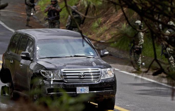 Imágenes del vehículo muestran diversos impactos de bala en el cristal blindado del copiloto.