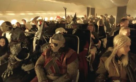 Mientras Arwen explica a un hobbit como abrocharse correctamente el cinturón de seguridad, Gandalf explica a Gollum la forma en la que uno puede guiarse a través del avión cuando las luces están apagadas.
