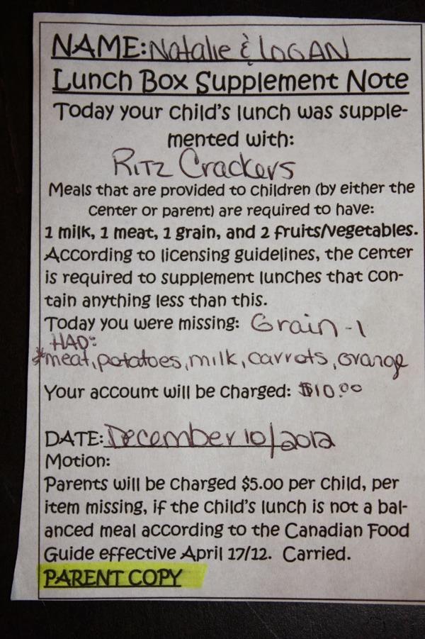 Una guardería del gobierno canadiense multó a una mujer con 10 dólares por, según ellos, mandar a su hijo a la escuela con un refrigerio “no balanceado”. Las comidas de los niños, según la regulación, deben contener una porción de leche, una de carne, una de granos y dos de frutas y vegetales. En este caso, el lunch consistía de todo, menos granos: carne, papas, leche, zanahorias y una naranja. Para compensar, la escuela le dio al niño un paquete de galletas saladas.