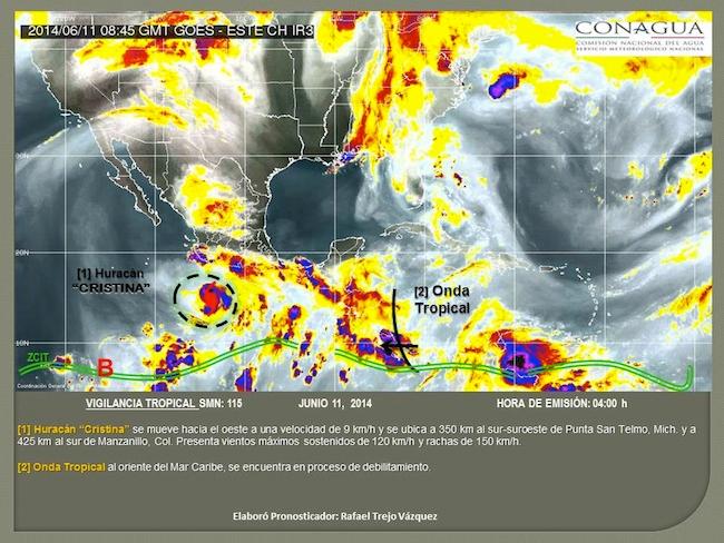 Detalló que el huracán Cristina avanza con vientos máximos sostenidos de 120 kilómetros por hora y rachas de 150 kilómetros por hora.