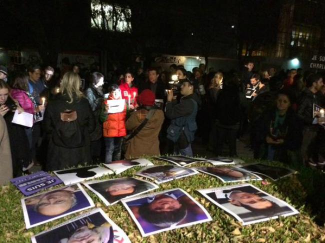 Rassemblement en défense de la liberté d’expression devant l’amb./Concentración #CharlieHebdo pic.twitter.com/rTAEkiHwbR