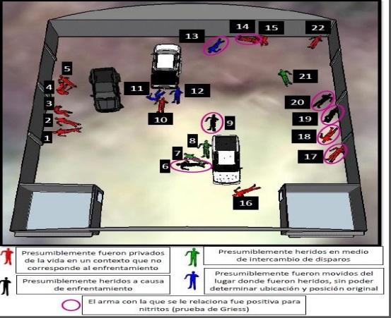 En el caso del examen en criminalística, el magistrado Adalid Landa concluyó que el estudio, realizado tres meses después de los hechos, confirma daños a los vehículos que participaron así como disparos en las instalaciones, sin embargo, no es útil para determinar que hubiera un segundo tiroteo luego del enfrentamiento inicial de 8 minutos.