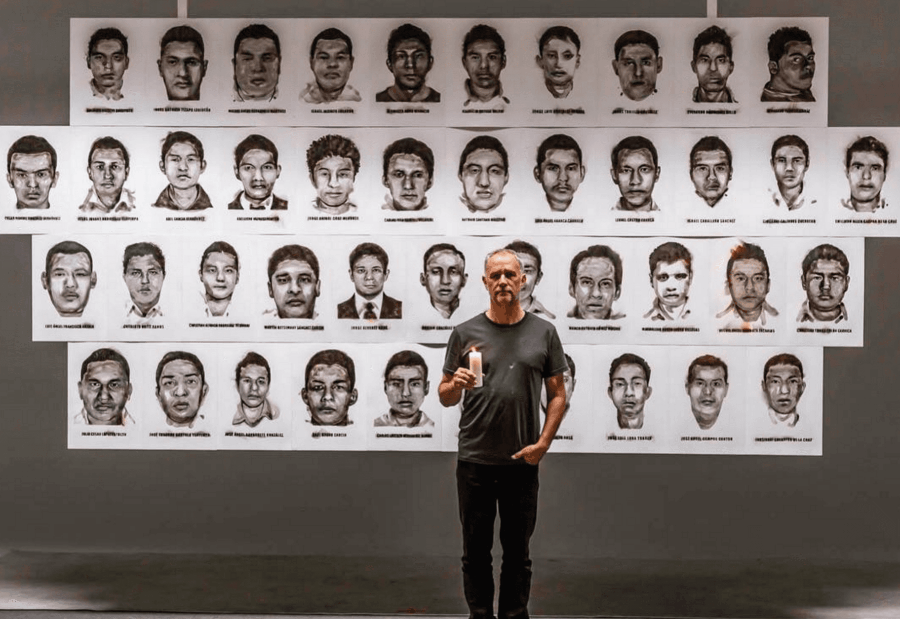 Steven Spazik, artista del fuego, creó un mural con el fuego de una vela para recordar a los 43 normalistas desaparecidos en México el 26 de septiembre de 2014. Esto forma parte de las conmemoraciones por el Día Internacional de las Víctimas de Desapariciones Forzadas.