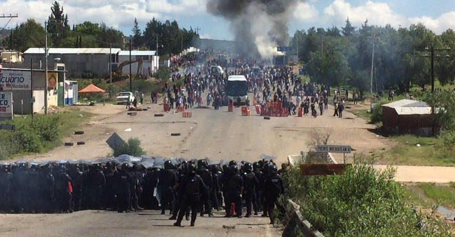 La policía estatal refiere que hubo disparos poco después de las 9:15 de la mañana. Para “dispersarlos y desalentarlos de su actitud violenta”, los policías lanzaron gases lacrimógenos, provocando que los manifestantes se replegaran a los límites del panteón municipal, “escuchando en esos momentos detonaciones de armas de fuego que provenían de los manifestantes que se encontraban en el panteón”.