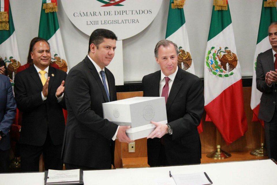 En el Salón de Protocolo del órgano legislativo, el presidente de la Mesa Directiva de la Cámara de Diputados, Edmundo Javier Bolaños, recibió de manos del secretario de Hacienda la propuesta de paquete económico para el año próximo.