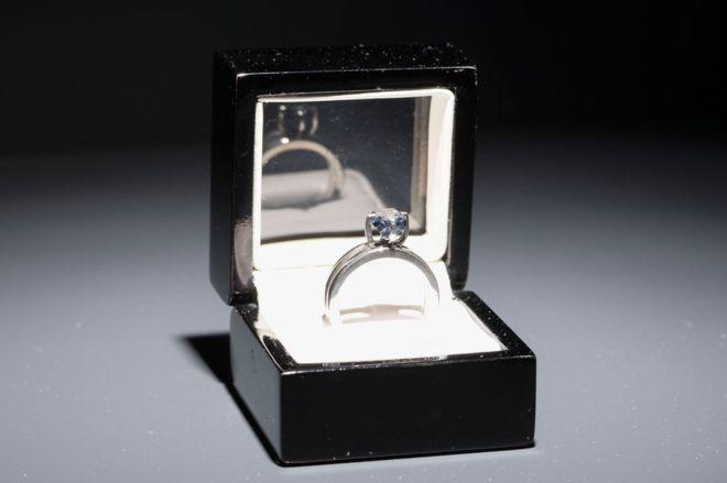 Está engarzado en un aro plateado, a modo del clásico anillo de compromiso de los anuncios de Tiffany’s.