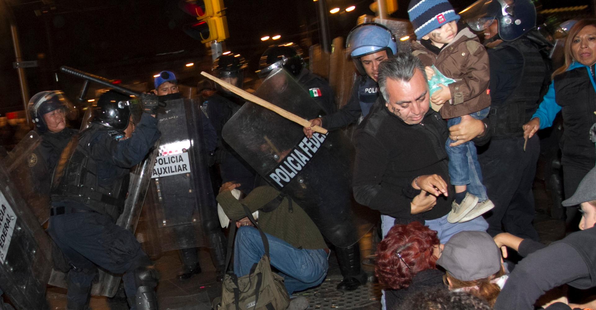 En una acción coordinada, las policías federal y capitalina dispersaron a golpes a los manifestantes, atacaron negocios que dieron refugio a aquellos que intentaban guarecerse, e incluso apagaron la iluminación pública de la Plaza de la Constitución y de los corredores peatonales del Centro Histórico, para dificultar a las personas una evacuación rápida y, por el contrario, facilitar su acorralamiento.