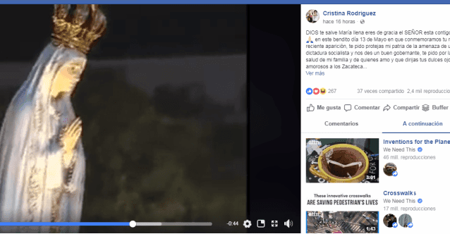 La publicación en Facebook – realizada en conmemoración de la “más reciente aparición” de la virgen – ha sido compartida 35 veces y tiene 267 reacciones hasta el momento.