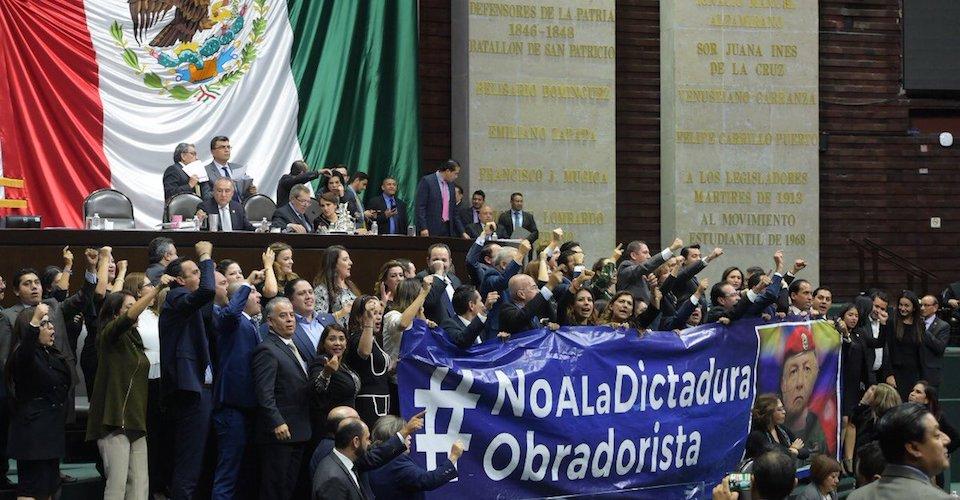 Después de que la reforma quedara aprobada en lo general y cuando había que pasar a la discusión de artículos en particular, los panistas, que durante las tres horas de discusión fueron los más férreos opositores, comenzaron a gritar “no al dictador, no al dictador”, mientras del lado de Morena gritaban “es un honor estar con Obrador”.