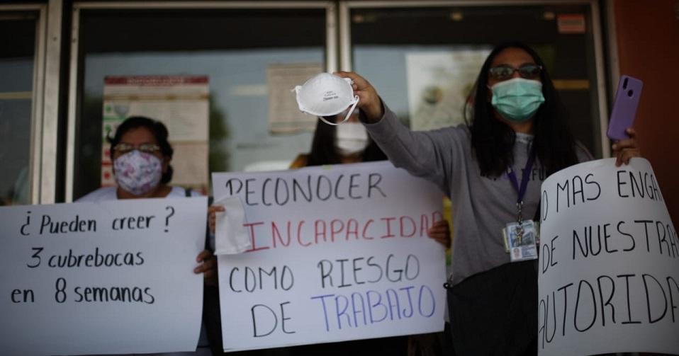 “Desde que empezó la epidemia de COVID-19 nos han dado poco material: mascarillas N95 contadas, una por semana o una cada quince días. No nos han dado goggles. Pero eso sí, anoche nos avisaron que ya había llegado de todo. Ahorita ya hay filtro en la entrada donde te toman la temperatura. Ya están llenas las botellas de alcohol gel. ¿Por qué? Porque se enteraron de que haríamos la protesta”, dice Pilar Fragoso, enfermera del turno de la noche, en el Hospital de Gineco obstetricia 60 del IMSS, en Tlalnepantla.
