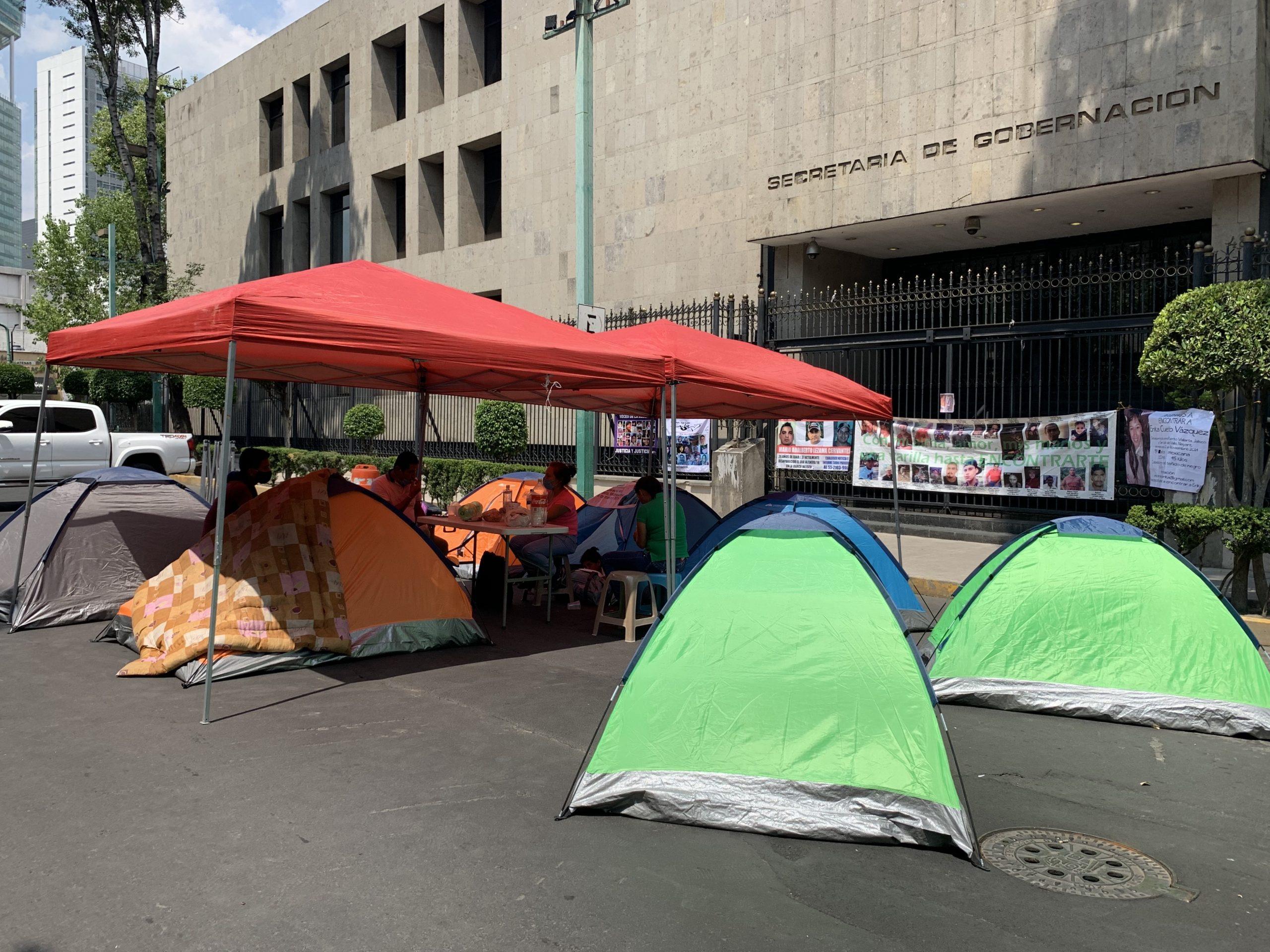 Como esa puerta ya no se abre, las mujeres pudieron colgar en todo lo ancho de la entrada de la Secretaría de Gobernación las fotos de sus familiares desaparecidos y los mensajes de que los devuelvan con vida, como se los llevaron. Enfrente, en una calle solitaria, sin tránsito, sin gente, armaron casas de campaña e instalaron un plantón que duró 12 días, en medio del silencio, sin más testigos de su protesta que los policías que resguardaban el edificio.