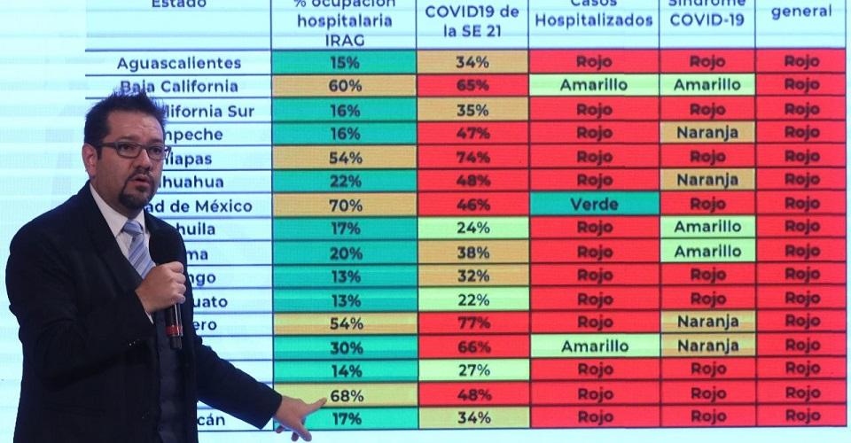 Ricardo Cortés Alcalá, director general de Promoción de la Salud,explicó que para definir el color del semáforo se consideraron cuatro indicadores. Dos son de proporción: el porcentaje de ocupación hospitalaria y el de positividad al virus SARS-COV2, que se saca de los resultados emitidos por la Red de Laboratorios de Salud Pública.