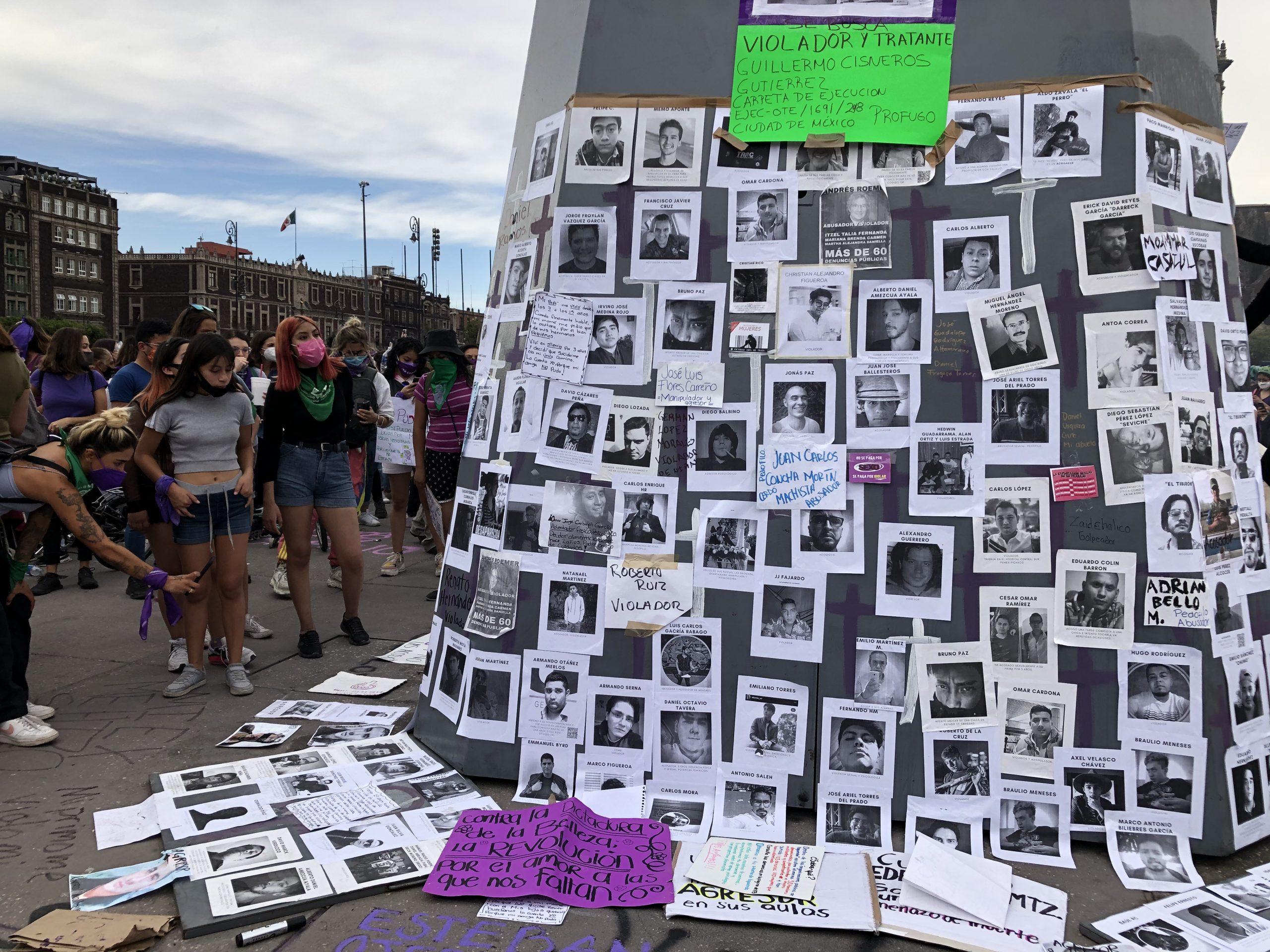 Por eso, al llegar al Zócalo, el destino final de la marcha, la base del asta bandera se convirtió en un muro de la denuncia. Decenas de fotografías con nombres y apellidos, describiendo el tipo de agresión tapizaron la estructura.