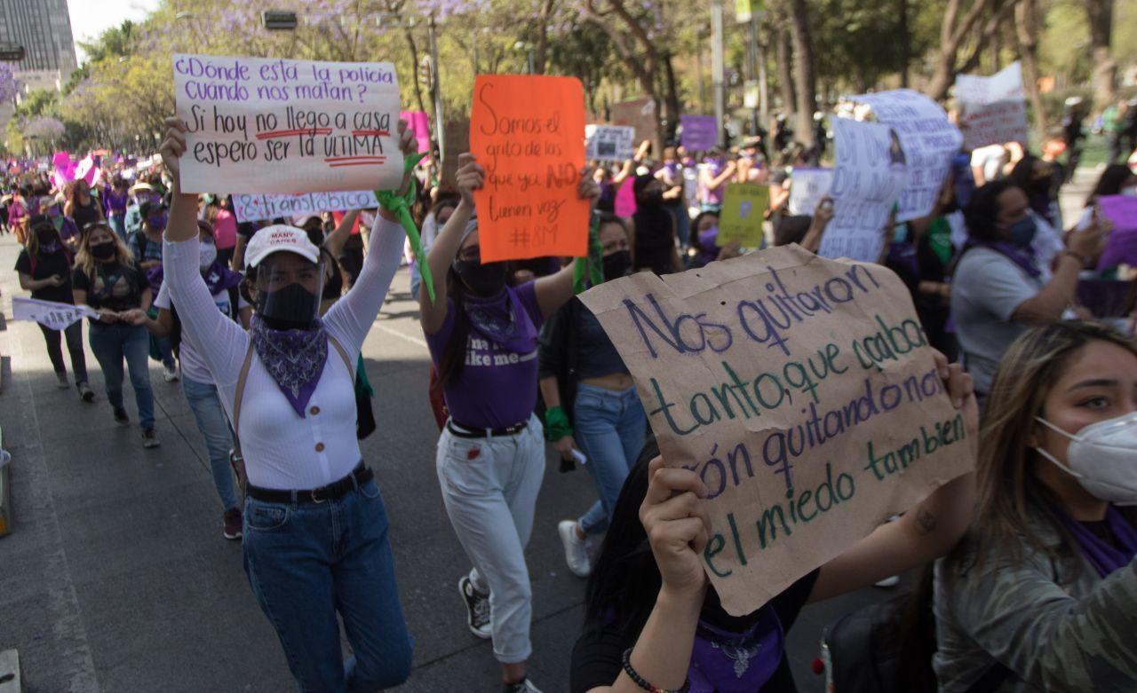 Al grito de “Ni una más, ni una más, ni una asesinada más”, “Vivas nos queremos”, “Con falda o pantalón respétame cabrón”, “Hay que abortar este sistema patriarcal” y “Nos queremos vivas”, mujeres e integrantes de diversas colectivas avanzan por las principales calles de la ciudad.