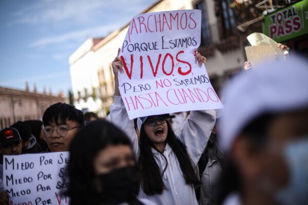 Los manifestantes portaban carteles con las leyendas: “Queremos paz”, “Ya basta” y “Los queremos vivos”, en referencia a las personas que han desaparecidos en las carreteras de Zacatecas.