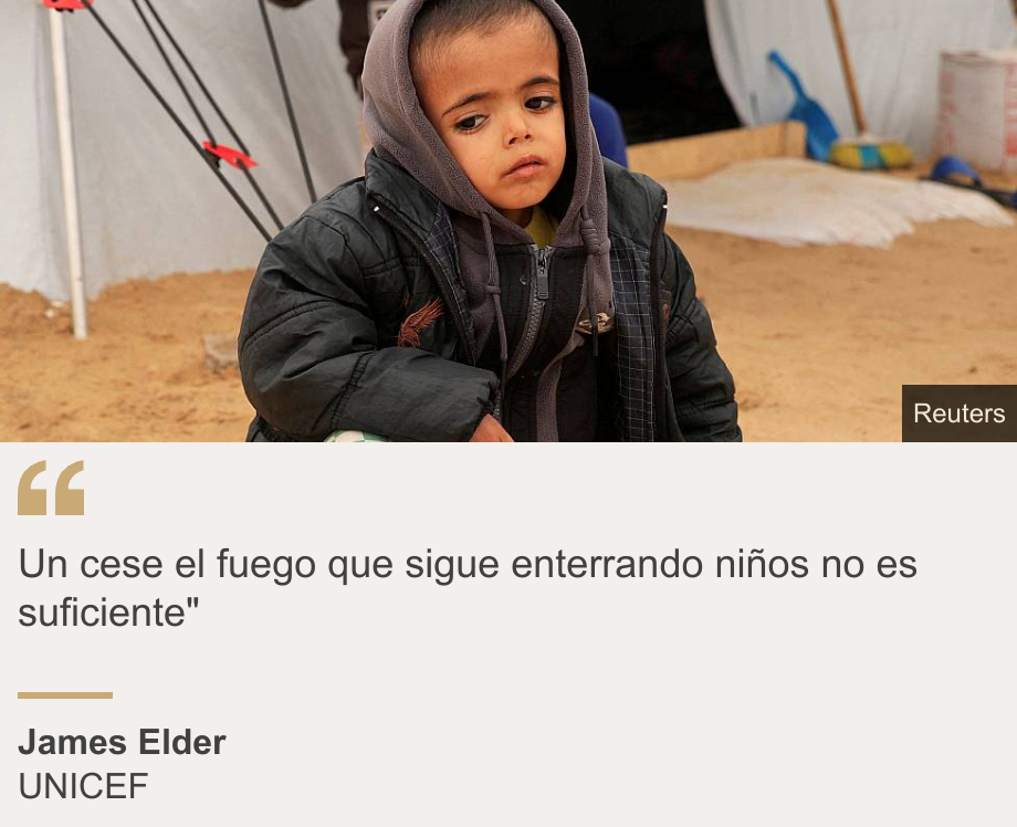 “Cuando decimos que más de cien niños murieron en ataques israelíes desde el cese el fuego quiere decir que mataron una niña o un niño por día durante una tregua. Cien es el número que hemos podido confirmar, por desgracia puede ser mayor”, dijo Elder a BBC Mundo.