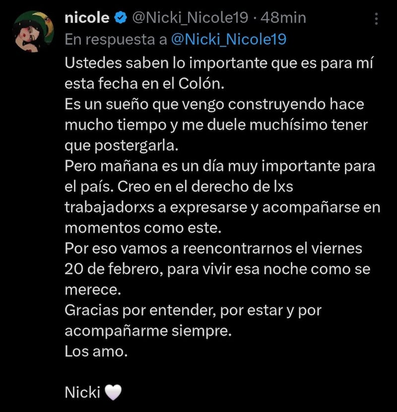 Nicki nicole anunció que el show en el teatro colon sera el 20 de febrero 🤍🤍 pic.twitter.com/TzFvdkU2QI