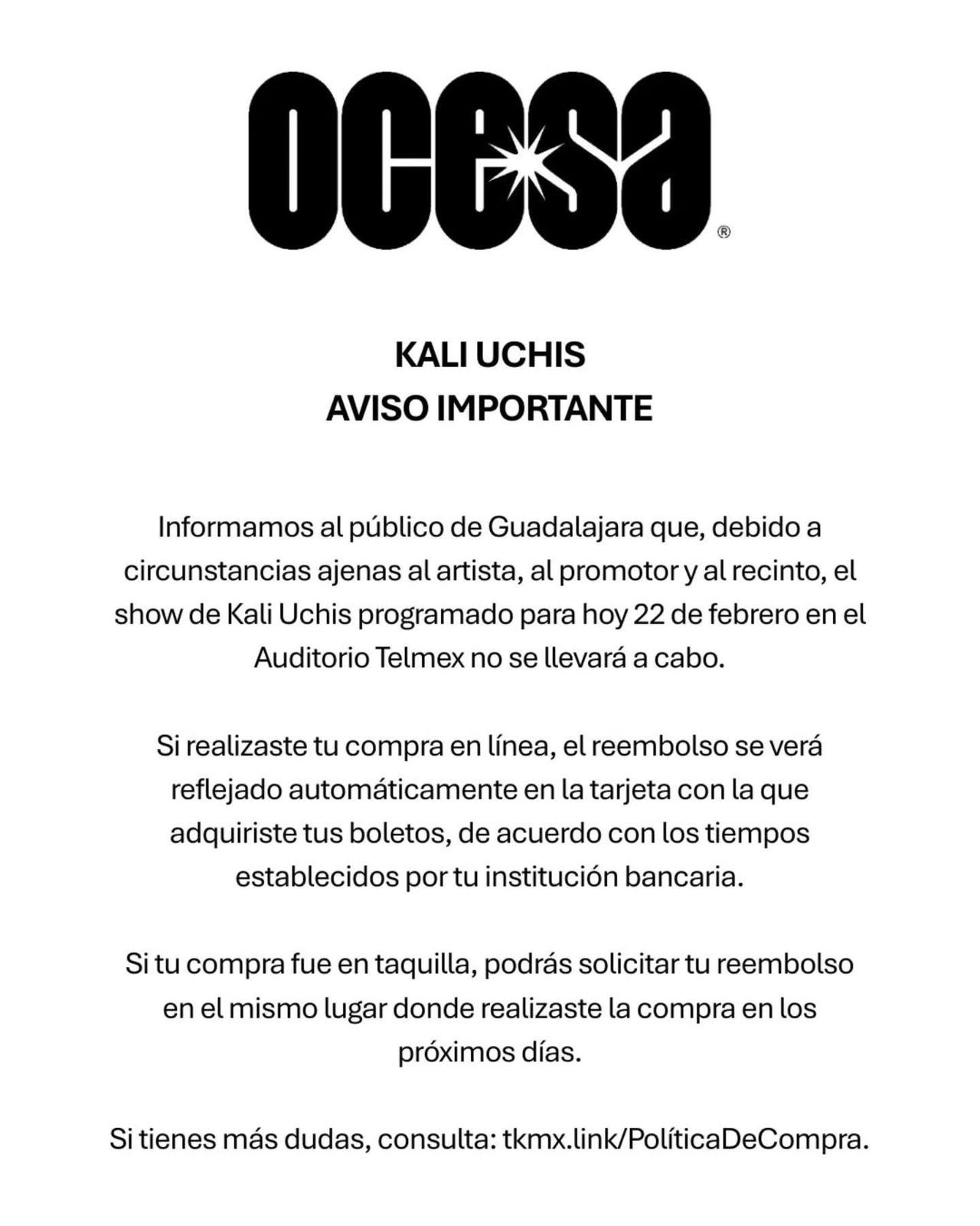 De igual forma en el Auditorio Telmex se realizaría el show de la cantante estadounidense, Kali Uchis. OCESA dio a conocer que el evento se cancelará y que los reembolsos serán realizados.