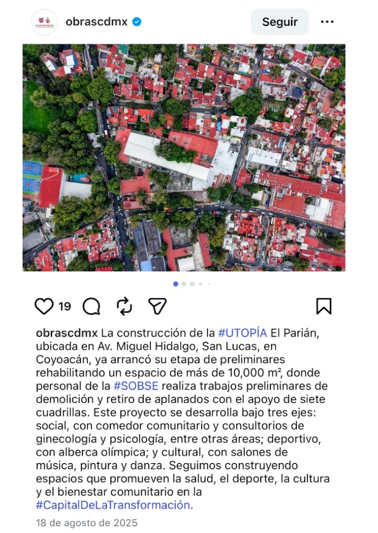 En julio de 2025, el gobierno capitalino lanzó la licitación pública para la construcción de la Utopía en El Parían. El 18 de agosto de ese año, la Secretaría de Obras de la Ciudad de México informó que iniciaron las obras preliminares para la construcción de este proyecto.