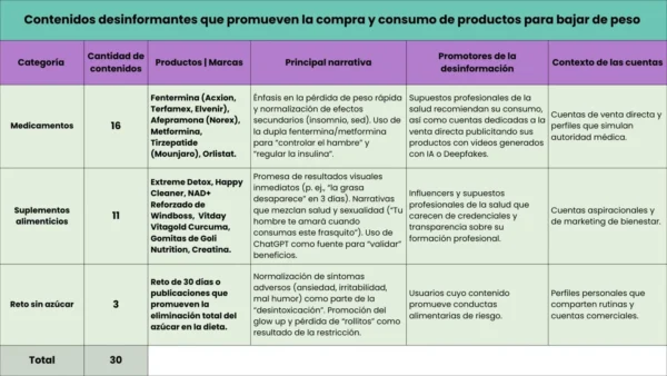 Esto ha facilitado la circulación de contenidos desinformantes sobre productos que construyen y refuerzan narrativas de delgadez como ideal estético, cuyo objetivo central es promover su consumo sin advertir sobre efectos secundarios ni riesgos a la salud.