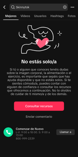 Para ofrecer otras soluciones, desde 2021 TikTok trabaja de la mano de Comenzar de Nuevo, una asociación civil con más de 26 años dedicada al tratamiento multidisciplinario de TCA en México y otros países de América Latina. Además de colaborar en la identificación de contenido de riesgo, esta organización gestiona la única línea de ayuda a quienes realizan búsquedas relacionadas con trastornos de la conducta alimentaria en la región.