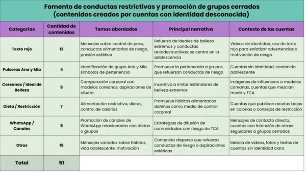 Además, en el monitoreo se encontró que los usuarios migran hacia plataformas de mensajería privada, donde se crean comunidades cerradas que comparten esta información acompañada de rutinas o “retos” relacionados con la restricción alimentaria.