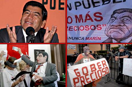 Desde ayer por la mañana fueron colocadas varias mantas en contra del ahora exgobernador en la capital poblana, en las que sus autores celebraban la salida del priista y recordaron su participación en la conjura contra la periodista Lydia Cacho. En las mantas se leían consignas como: “En Puebla no más preciosos. Hasta nunca Marín” y “Mario Marín, te queremos… en la cárcel”.