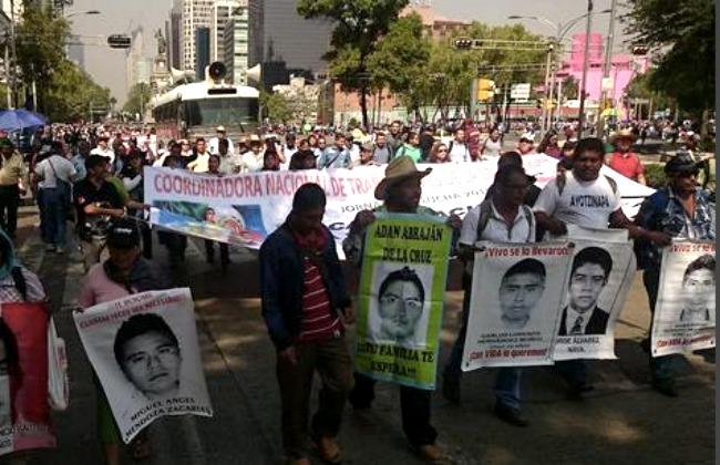 En la manifestación, profesores también cargan carteles referentes a los 43 estudiantes de la Normal Rural de Ayotzinapa desaparecidos.