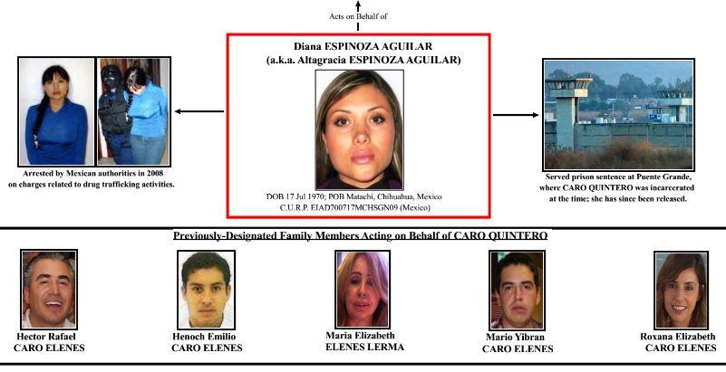 El Departamento del Tesoro de EU incluyó en su lista negra de personas relacionadas con el crimen organizado a Diana Espinoza Aguilar, pareja del narcotraficante Rafael Caro Quintero, que es uno de los líderes de la Organización de Sinaloa / Cártel de Guadalajara, y se encuentra prófugo desde el 23 de enero de 2015.