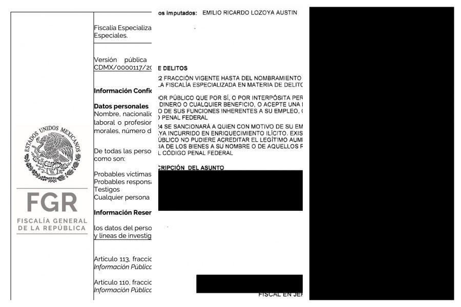 En cuanto a la difusión en versión pública de la carpeta de investigación iniciada por los supuestos sobornos denunciados por Lozoya, la FGR publicó los primeros 23 tomos de dicha indagatoria en el apartado de “transparencia focalizada” de su página web. Sin embargo, la mayor parte de la información es ilegible.
