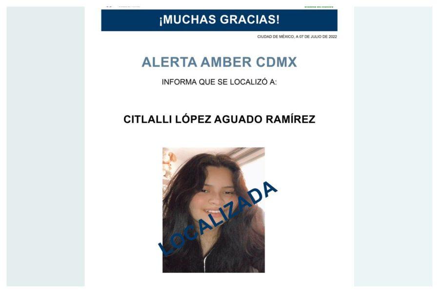 Ha sido localizada la menor de edad Citlalli López Aguado Ramírez, agradecemos a la ciudadanía, medios de comunicación e instituciones, se desactiva #AlertaAmber https://t.co/eAZvwMfxS6 pic.twitter.com/FIWkUAWP82