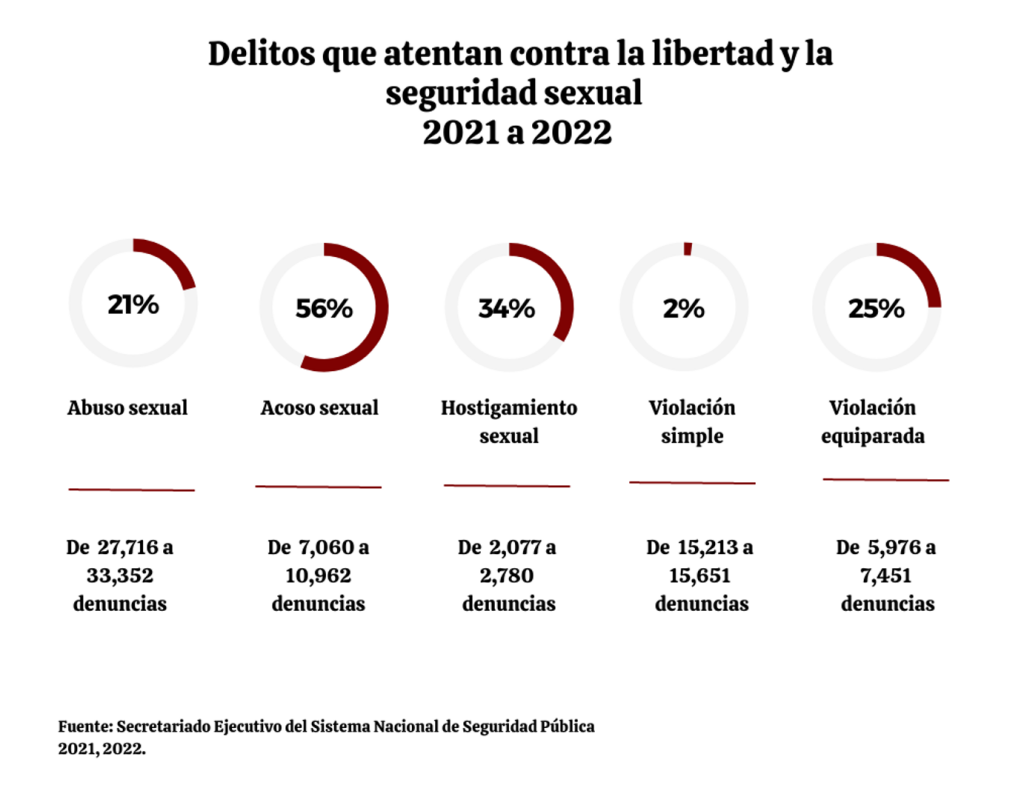 La lista de actos violentos contra niñas y niños también implica historias de abuso, violación y maltrato. La organización Save the Children estima que, en México, al menos 37 menores sufren violencia física diariamente. El Secretariado Ejecutivo del Sistema Nacional de Seguridad Pública (SESNSP) reportó que durante el 2022 se denunciaron 33,352 casos de abuso sexual, 10,962 casos de acoso sexual, 2,780 casos de hostigamiento sexual, 15,651 casos de violación simple y 7,451casos de violación equiparada. En la siguiente gráfica se observa el incremento sustancial de este tipo de delitos, de los cuales, en muchas ocasiones, las víctimas son niñas y niños.