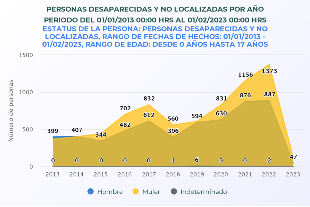 De 2013 a 2023 siguen sin ser localizadas 7,402 niñas y 5,674 niños, es decir, es mayor la proporción de vulnerabilidad en el que se encuentran las niñas, tal y como se muestra en el siguiente gráfico. Respecto al rango edad, el periodo que va de los 14 a los 17 años es en donde más riesgo de desaparecer sufren niñas y niños. Estado de México, Tamaulipas y la Ciudad de México son las entidades en donde más menores no han sido localizados.