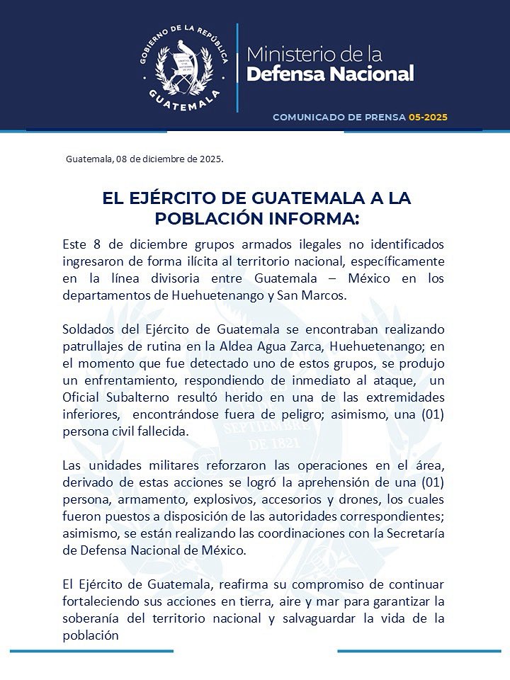 “Soldados del Ejército de Guatemala se encontraban realizando patrullajes de rutina en la Aldea Agua Zarca, Huehuetenango; en el momento que fue detectado uno de estos grupos, se produjo un enfrentamiento, respondiendo de inmediato al ataque, un Oficial Subalterno resultó herido en una de las extremidades inferiores, encontrándose fuera de peligro; asimismo, una persona civil fallecida”, informó en un comunicado el Ministerio de la Defensa Nacional (Mindef).