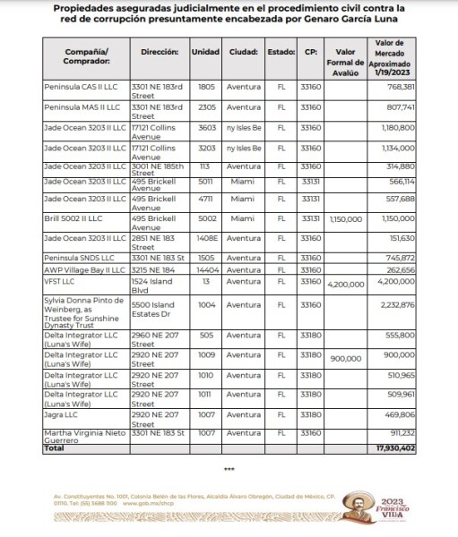 De acuerdo con el informe de las autoridades mexicanas, hasta el momento se han asegurado 19 propiedades, todas ubicadas en Florida, Estados Unidos, y con un valor de mercado estimado en 17,930,402 dólares.