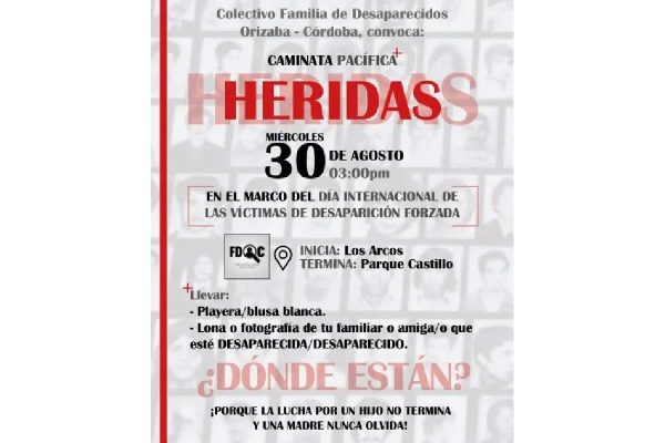 Ante los casos de desapariciones forzadas que se registran en el estado, el Colectivo de Familias de Desaparecidos Orizaba-Córdoba realizará una caminata pacífica a las 15:00 horas de este miércoles a la cual denominaron “Heridas”.