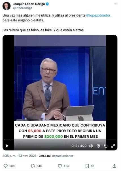 Asimismo, en el video que desinforma se puede observar un movimiento de labios poco natural y el mismo López Dóriga anunció en su cuenta de X, antes Twitter, que se trata de un video falso.